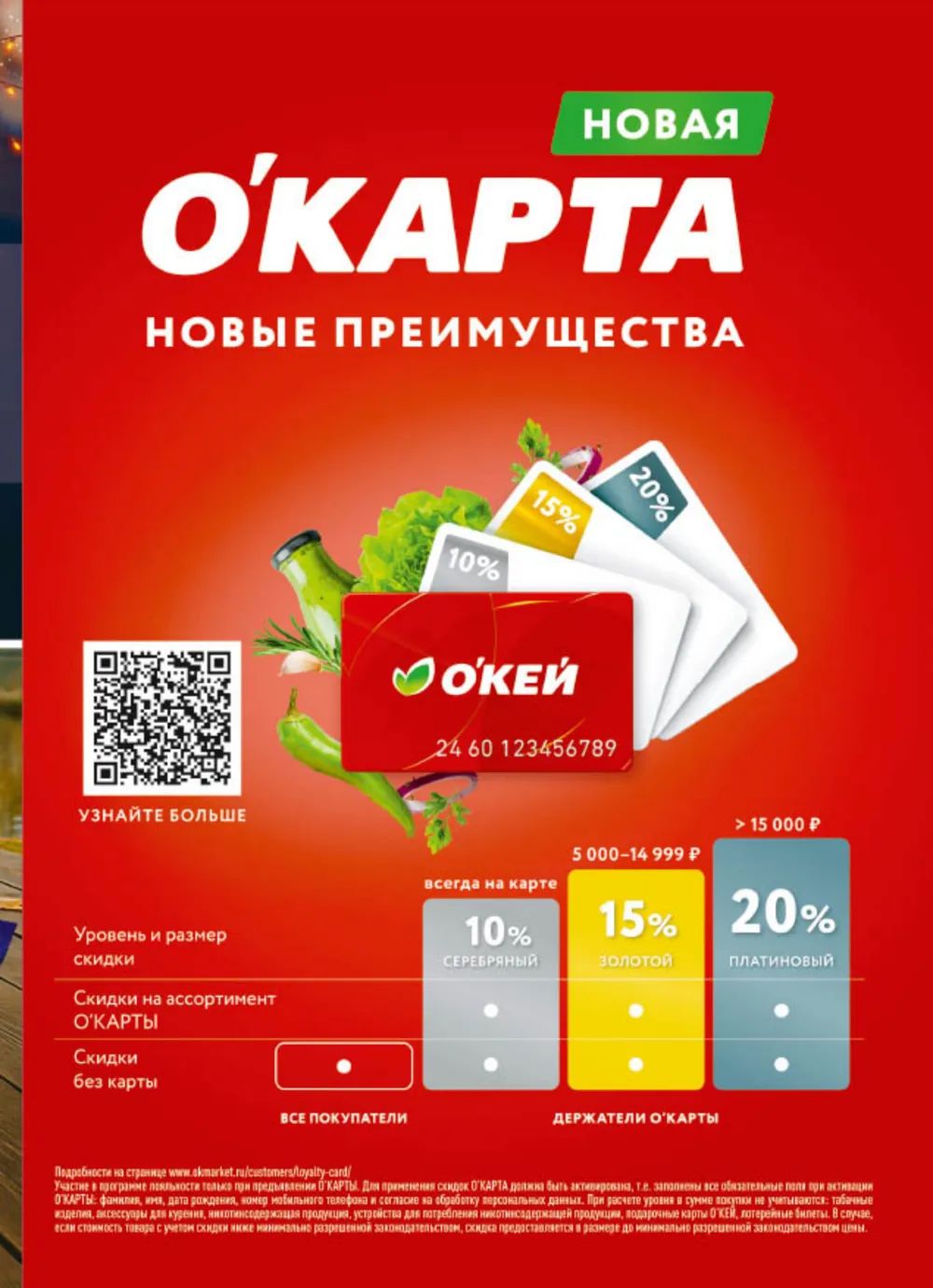 В сети «Окей» существует карта постоянного покупателя. Держатели таких карт получают скидки до 50% на товары из каталога. Таким образом, используя каталог товаров, вы можете по самой выгодной цене купить свыше 300 наименований продукции. Пользоваться картой очень просто. Вы заходите в гипермаркет, выбираете товары и на кассе предъявляете ее. Приобретая карту, вы получаете скидки на разные группы товаров, а так же возможность участвовать в розыгрышах призов, конкурсах и других специальных акциях.